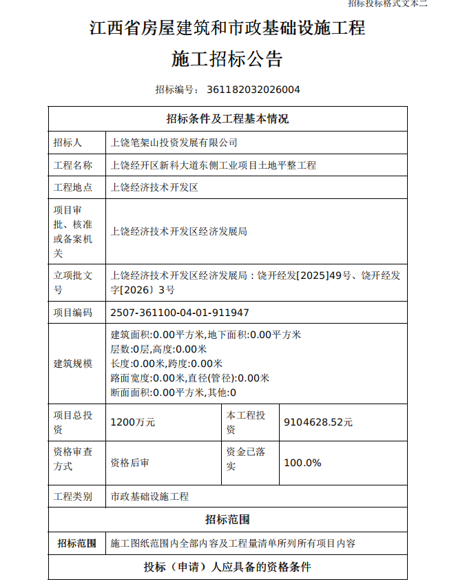 上饒經(jīng)開區(qū)新科大道東側(cè)工業(yè)項目土地平整工程施工招標(biāo)公告
